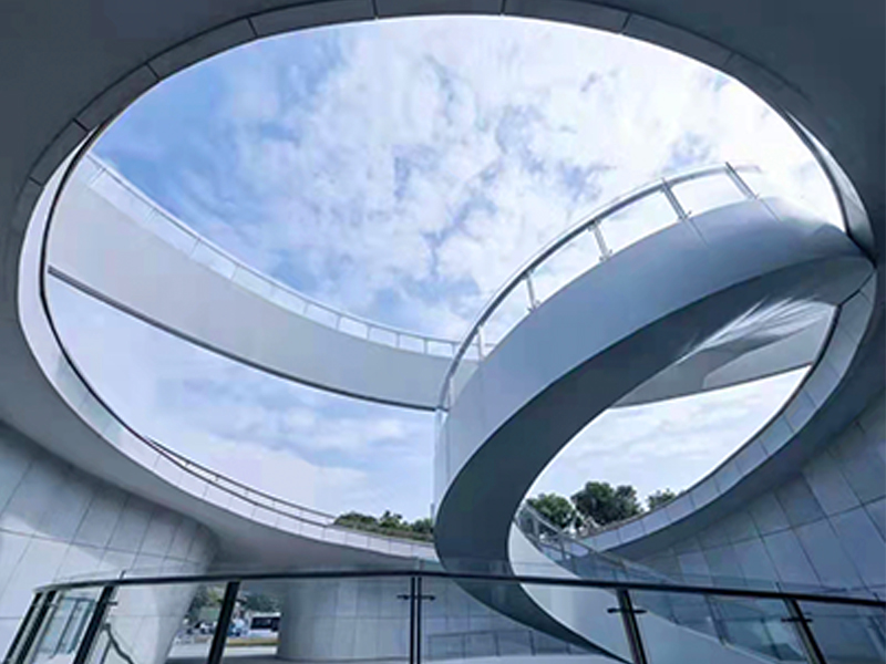 双曲面铝单板产品造型奇特、工艺复杂,公司采用德国进口成型机,配合专用数控双曲软件生产出成品,产品表面平滑,可任意定制双曲面、球形面,制造出独特美观的立体造型。公司利用蒙皮拉伸技术和三维建模原理解决了行业的技术难点,板面效果比常见的通过分割焊接生产的双曲板平整度好,安装效果比以直代曲等的双曲弧线更圆滑,公司成为行业为数不多的双曲面、异形铝单板的企业之一,双曲产品为设计师提供了更为广淘的设计空间,充分展示了双曲面铝单板在金属幕墙上无可代替的特点。